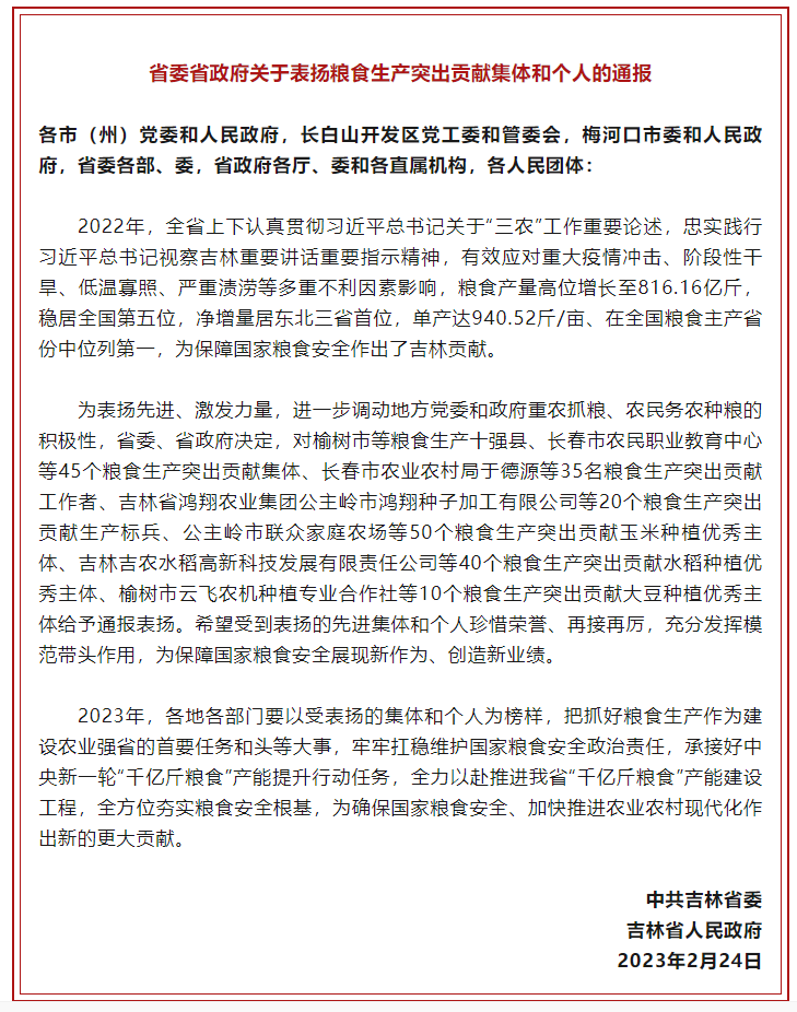 热烈祝贺我公司被评为“粮食生产突出贡献生产标兵 ”